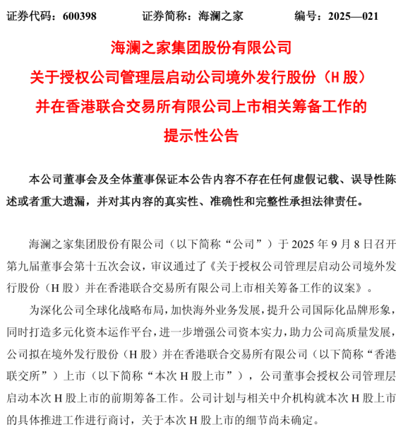 海澜之家9月8日晚发布公告,为深化公司全球化战略布局,加快海外业务发展,提升公司国际化品牌形象,同时打造多元化资本运作平台,进一步增强公司资本实力,助力高质量发展,公司拟在境外发行股份(H股)并在香港联交所上市。
