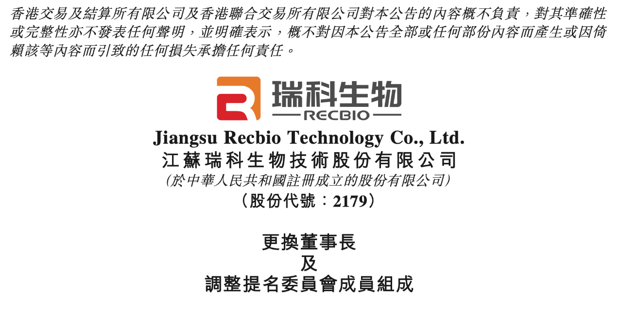 2025年12月23日,江苏瑞科生物技术股份有限公司(股票代码:2179.HK,以下简称“瑞科生物”)正式公告董事会重大人事变动:原董事长刘勇博士辞去董事长及提名委员会主席职务;扬子江药业集团董事长徐浩宇先生获选为公司新任董事长。