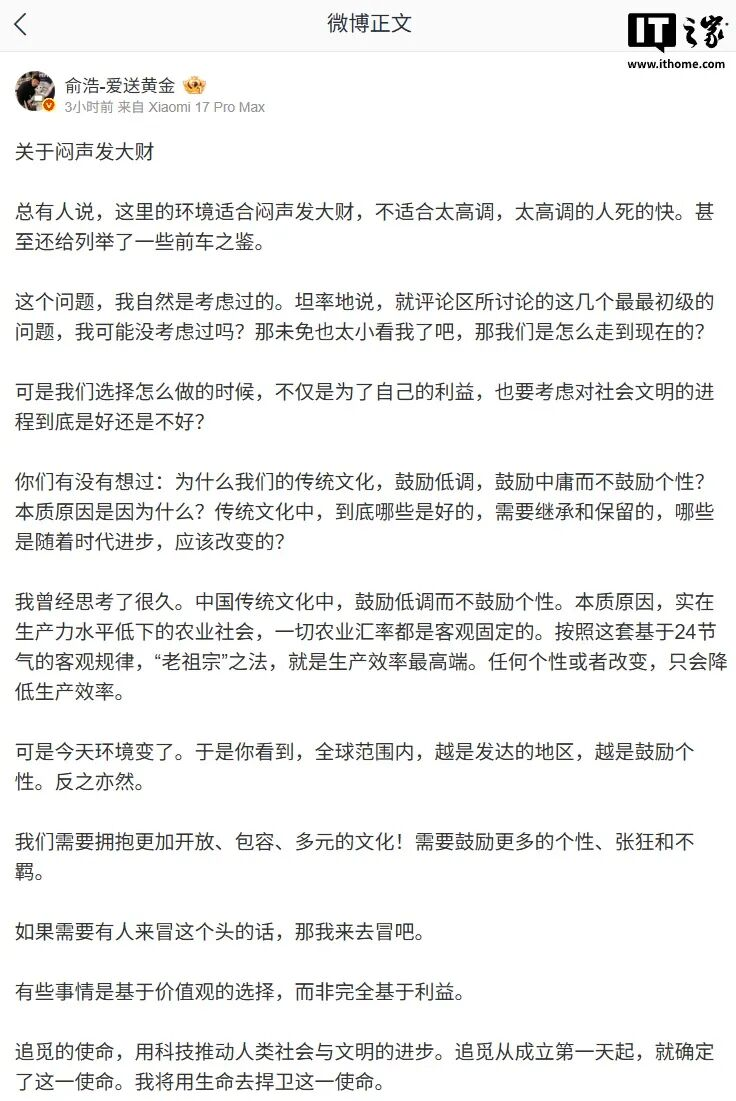 随即表示,当前环境已不同于生产力水平低下的农业社会,不再适合完全遵循强调低调、抑制个性的旧有文化模式。他认为,在全球范围内,越发达的地区往往越鼓励个性与多元表达。 他提出应当拥抱更加开放、包容的文化,并鼓励更多个性、张狂与不羁。他进一步表示,追觅科技自成立之初,便将“用科技推动人类社会与文明进步”作为使命,这是基于价值观的选择,而非完全基于利益考量。